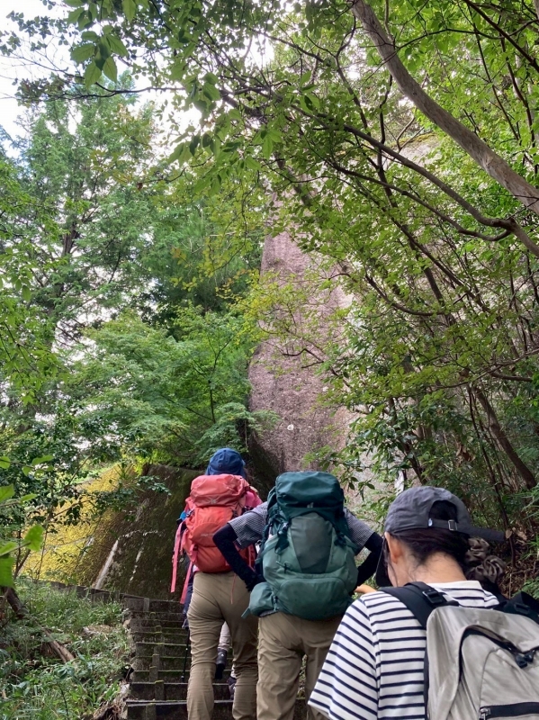 ルートは、そのほとんどが階段で、登山口からずっと階段が続きます。真夏の暑さと比べると、少しはましになりましたが、蒸し暑さは変わらず、すぐに汗だくになってしまいます。まだまだ熱中症への注意が必要と、水分や塩分をこまめに補給しました。