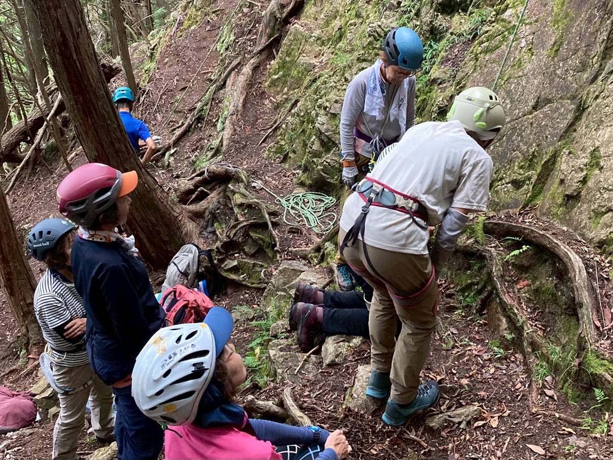当日、集合場所の江文神社でヘルメットとハーネスを装着して、岩登りのゲレンデへ移動しました。参加者6名にスタッフ3名、少人数で贅沢な岩登り講習会でした。