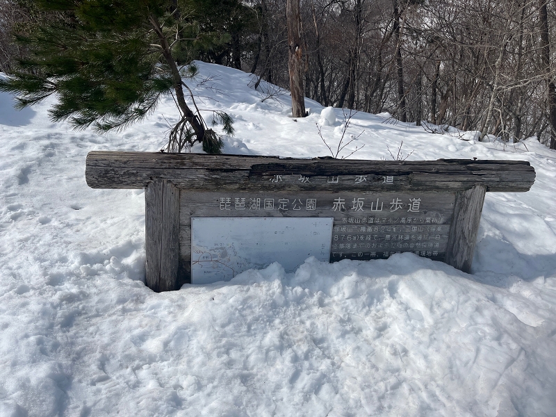 粟柄越からゆるやかな斜面を登ると赤坂山の山頂(824m)に着くが、帰りのバスの時間を鑑み、泣く泣く山頂到達を断念。