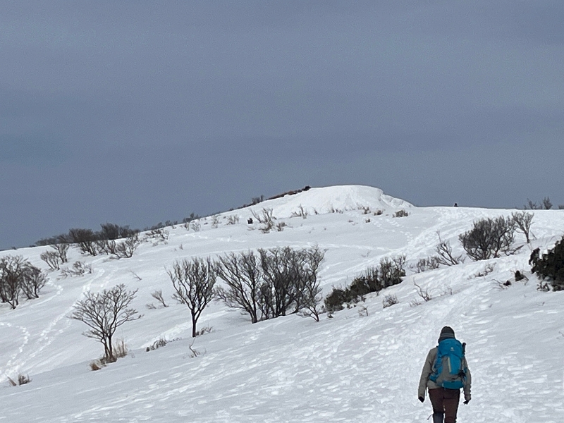 マキノ高原広場には大量の積雪があり、出発前にアイゼンやチェーンスパイクを装着。広場の中央を進み、トイレのあるところが登山口で、急坂をひと頑張りし傾斜の緩い尾根道となる。傾斜がきつくなったところで東屋のあるブナの木平に着く。東屋も大量の雪に埋もれている。いったん谷に下ってつづら折に急斜面を登るが、ゆるやかな登りに変わると粟柄越にたどり着く。